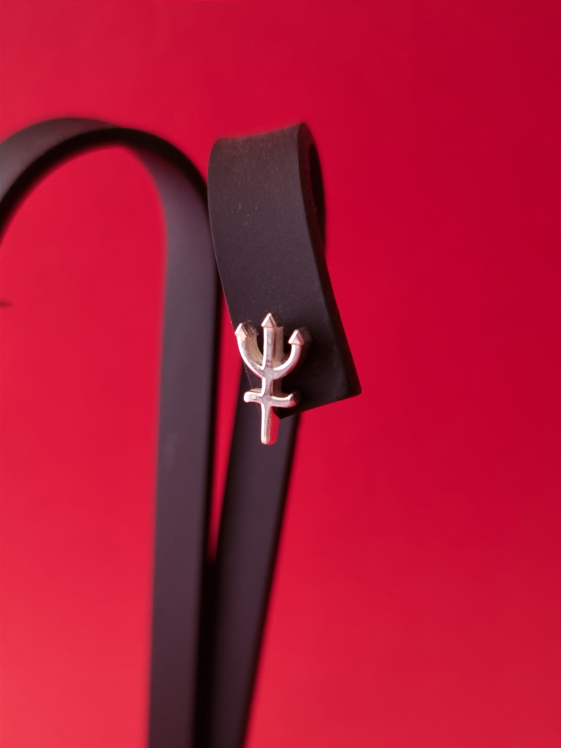 Joia com formato de tridente com as hastes curvadas, confeccionada inteiramente em prata 925, simbolizando POMBA GIRA.