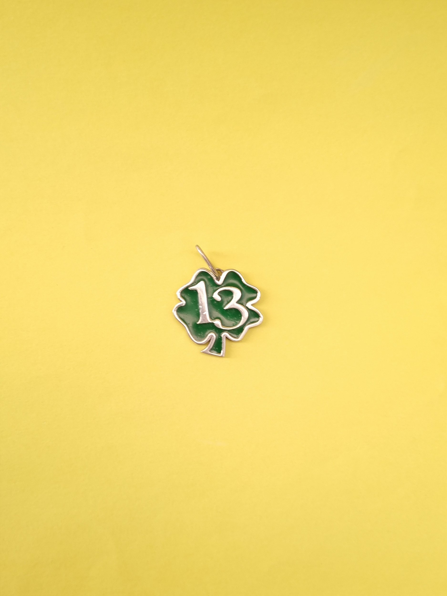 Joia em formato de trevo com u número 13 detalhado em alto relevo em seu interior, inteiramente confeccionado em prata 925.